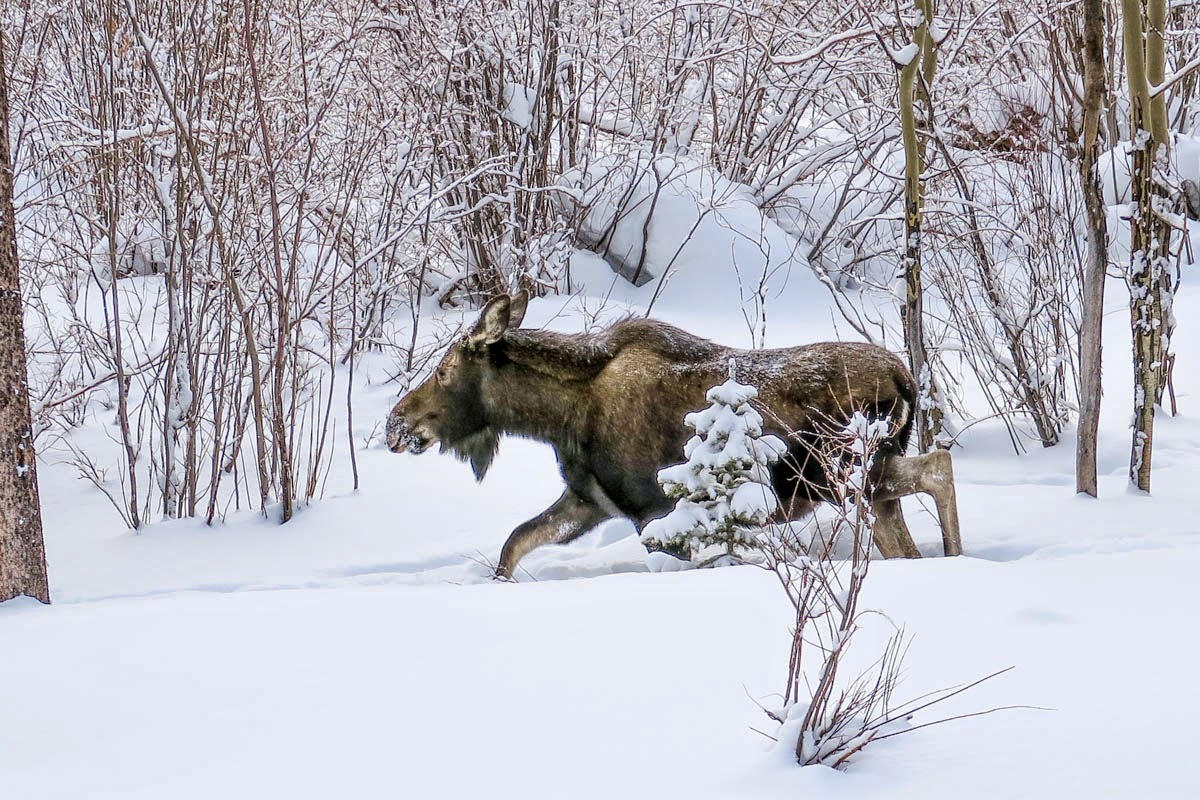 This morning my husband spied a couple of local moose standing on the road beside our house. They were looking up and down the road nervously, then decided to climb over the bank of snow left by the snowplow to plunge into the narrow wetlands behind the house. Below are a couple of photos that my husband snapped of them as they lumbered by.