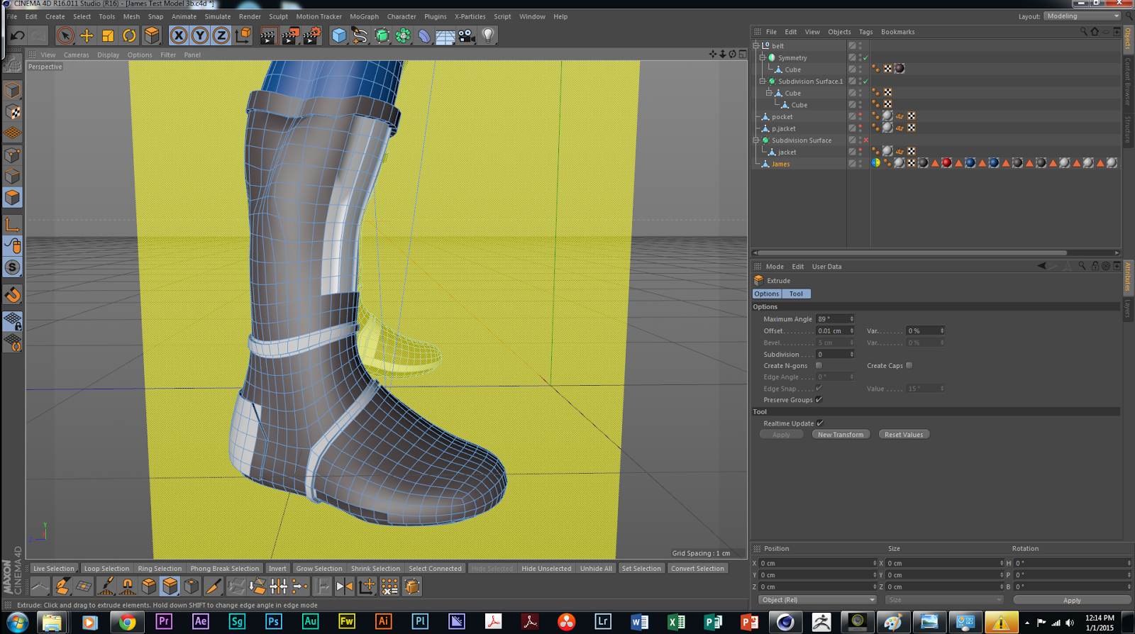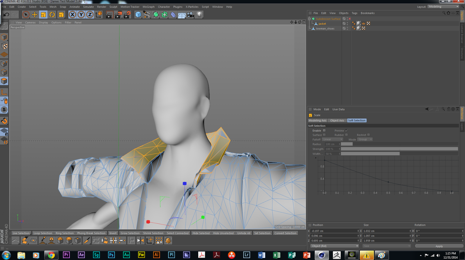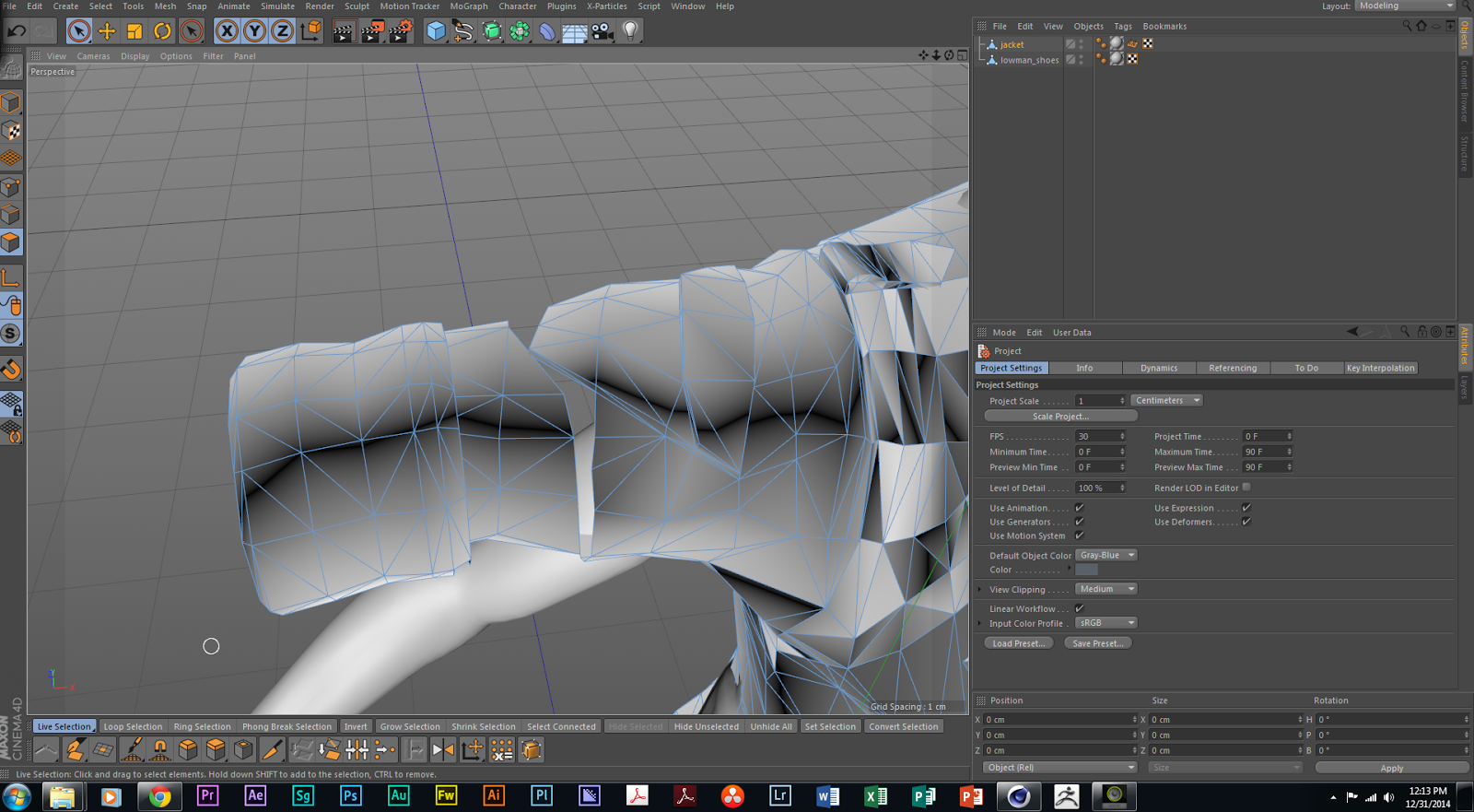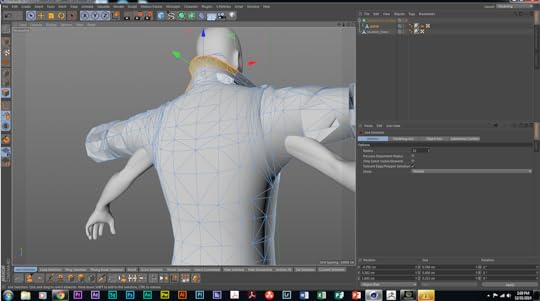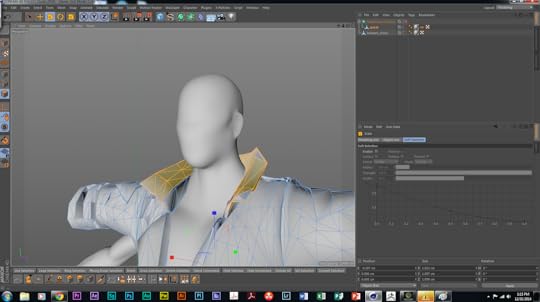 I started with a blank slate of a male figure. The idea was to find clothing that I did not feel comfortable creating myself since this was my very first character made in Cinema 4D. I also decided that his clothes will not be independent of his movements, except for his jacket might have different parts swing independently from the rest of his body. And possibly any custom gear I have to create. So my goal from the get-go was to fin a jacket to modify, and have the main body mesh have his shirt, pants, gloves, and boots.