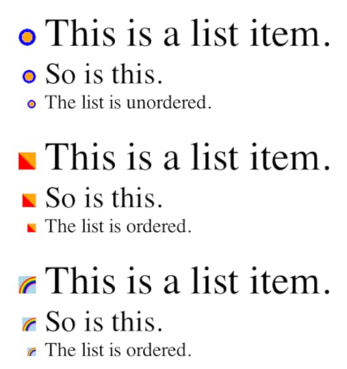 A third limitation, one not nearly so momentous, is that the list bullets are kind of small as compared to the list items’ font size in most browsers, but a bit bigger in others (as Ana Tudor pointed out; thanks, Ana!). So if you’re going to express yourself with list bullets, be bold and not too complex, and realize there will be some sizing differences across browsers.