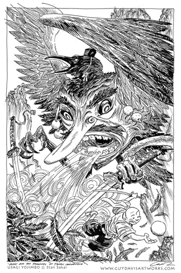 For the new pinup, I wanted to draw Usagi and the Tengu (from issue #65), with the Tengu changing into a demonic crow and placing them in a setting that hints at the end of an adventure that never happened (but hopefully will make the viewer imagine it did)!