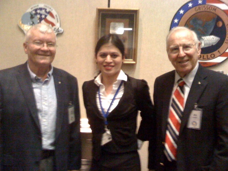 Here I am with the Apollo 13 crew! The Apollo Mission Control room in Building 30 is kept as much as possible in its historic state. The surviving crewmembers are Fred Haise (left) and Jim Lovell (right). Command Module Pilot Jack Swigert passed away in 1982. On the anniversary of Apollo 13 the crew and some ground personnel visited Johnson Space Center to share some memories. The mirror behind me has its own history--it was presented to the Mission Control crew by the Apollo 13 astronauts so they would be reminded who the real heroes were.