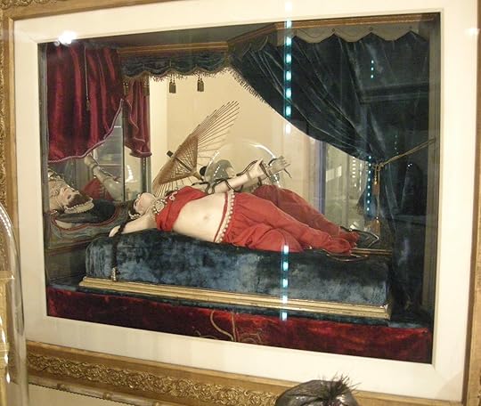 Many of the automata were under glass domes, and those scary monkeys were a popular theme as well! Apparently most automaton makers were French, and the monkeys were mocking the French aristocracy. Monkeys aside, many of the themes in Magic Under Glass were present in this exhibit, such as the 19th century fascination with Orientalism, leading to exotic figures reminiscent of Asia and the Middle East, that Nimira's "Trouser Girl" act was based on. I loved this belly dancer: