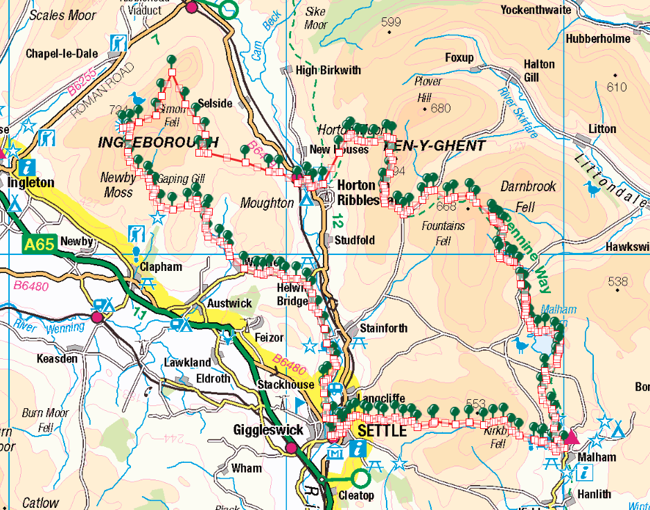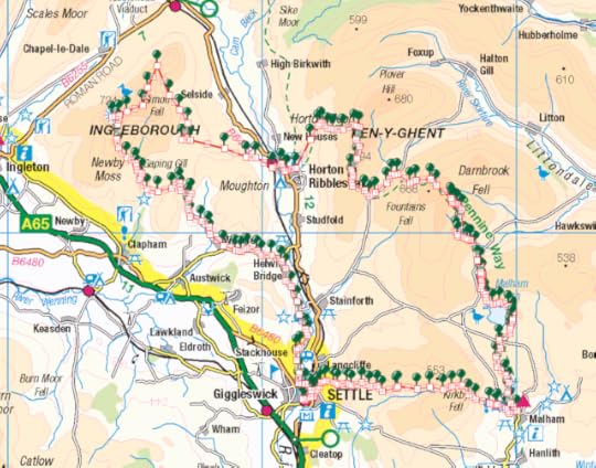 My route began and ended in Settle. Here is a link to the ViewRanger file. It's a reasonably obvious circuit: head east to Malham, then follow the Pennine Way to Horton in Ribblesdale before tackling Ingleborough from the east and returning to Settle. The original route I planned deviated slightly from the Way between Malham and Fountains Fell, but given the bad weather on day two I decided to stick to the established paths.