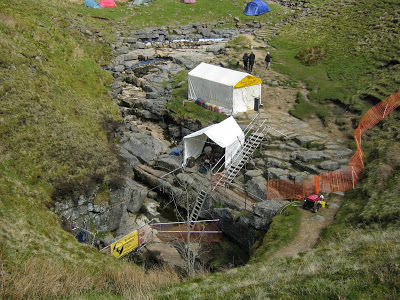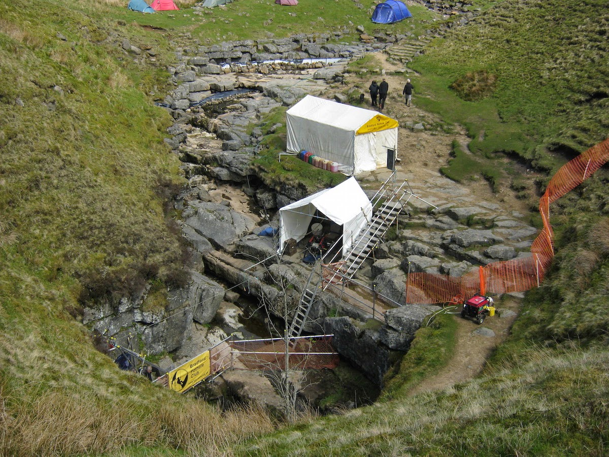 When I passed Gaping Gill, I saw an enormous encampment of tents and a semi-permanent-looking winch arrangement at the entrance. A sign identified the campers as members of the Bradford Pothole Club.