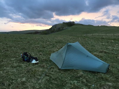 Finally, at about half past four, I realised I could go no further without encountering steeper ground where good camping spots would be difficult to find. It was still windy at this point but the forecast was significantly better for the next day. I found a stone wall to use as a windbreak and pitched the Notch.