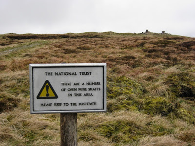 The first break in the weatherFountains Fell is a hill my dad has spoken of many times. I'd never set foot on it myself, though, and he warned me about a bog at the top. Nowadays a good trail cuts through the bog and I succeeded in reaching the summit plateau without any serious bog-squelching, although my feet had become wet from water splashing through the mesh uppers. This was expected – I was wearing lightweight trail runners, after all – but given how foul the weather was I hadn't begun my planned schedule of swapping socks every two hours to allow them to dry. I'd also promised myself I would stop every hour to air my feet (an important precaution in such conditions when wearing trail runners). However, again the foul weather deterred me from making these stops, and it was much too tempting just to press on and ignore my damp feet.At the top of Fountains Fell there was a rather alarming warning notice: