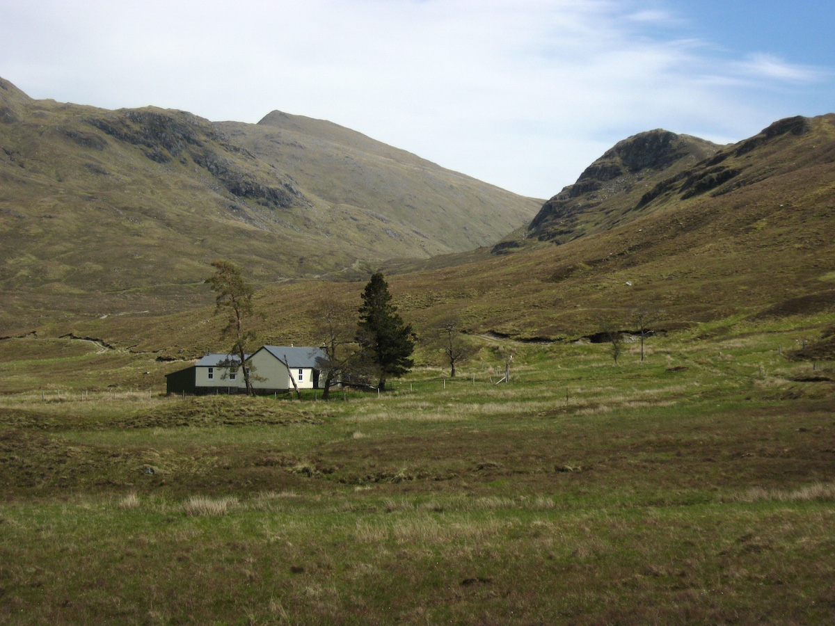 Looking back to Maol-BhuidheThe first section of the CWT from Maol-Bhuidhe gave me a choice: go north of Beinn Dronaig or south. The north route has a path for more of its length but you have to cross a wire bridge. I don't like wire bridges; I decided to take the south route, which looked wilder on the map. I followed an unnamed river (an outflow of Loch Cruoshie) for some miles over rough and boggy terrain, loving the wildness of my surroundings, spoiled only by an ancient deer fence quietly rusting into the ground. After some distance I followed a rising traverse line (careful navigation required here) until the beginnings of a very faint stalker's path that led directly to Bendronaig Lodge. The terrain was rough but, again, I remember thinking this is nothing compared to Knoydart!