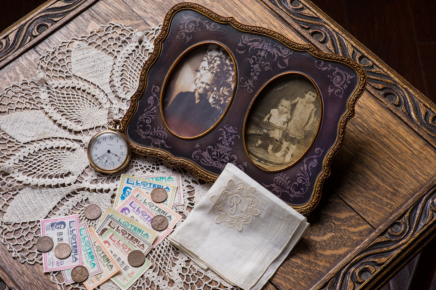 Without giving away too much of my novel’s plot, all the elements are directly from the story: the “portions” of lottery tickets with the winning number, the old photo of my Abuela Chepa, the healer and curandera of the novel next to the photo of my father, the protagonist, and his sister, Lila, taken in 1928, the antique handkerchief with the letter “R” and even the seven wheat pennies, with the date of the inciting incident, 1944. On an almost eerie note, the pocket watch belonged to my maternal grandfather, and hasn’t worked in thirty years, until the day of the photo shoot. The hands started moving again. I’m not overly superstitious, but I swear it’s true.