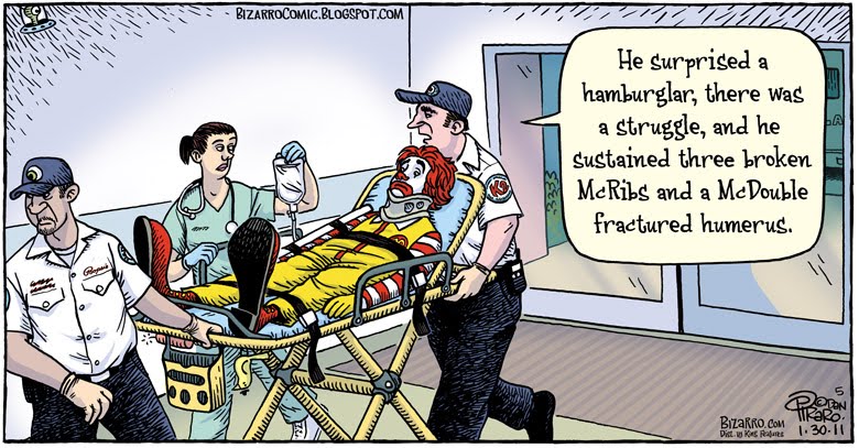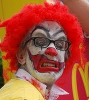 Ronald McDonald is perhaps the most malevolent clown of all. The fact that the sort of worldwide cruelty and destruction that the McDonald's corporation is responsible for is represented by a clown is like something from a horror movie. They guy owns thousands of things called slaughter houses, for one thing. "Slaughter" isn't a funny word. I wont' go into a lot of detail, but the animal cruelty, environmental destruction and international health crises that are wrought by cheap hamburgers and chicken parts is a holocaust. I know it's the way the world works and it will not likely ever change, I'm just saying it sends chills down my spine.