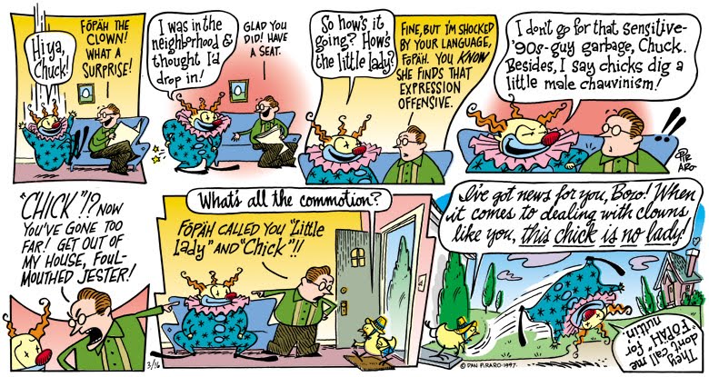 "Fopah the Clown" is a weird little story about politically correct language. I don't remember why I wrote it or what I was thinking, but I've never been a fan of PC language in general. After seeing it evolve over the past 30+ years, I think it is a great way to act like we're doing something to end discrimination without really doing anything. Seems to be little more than lip service.