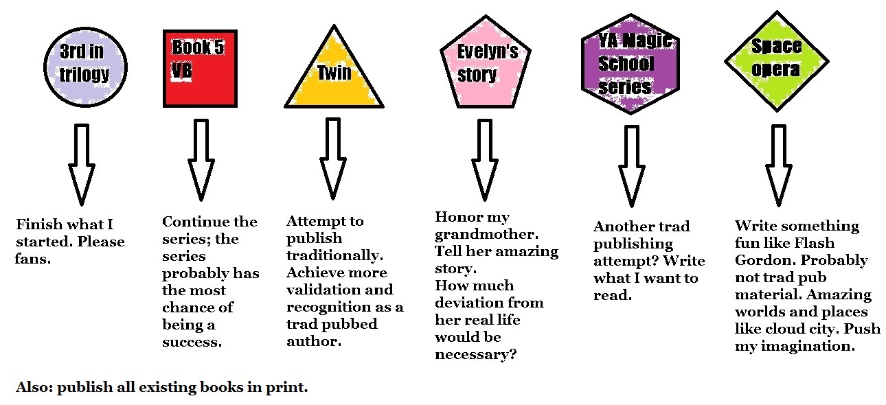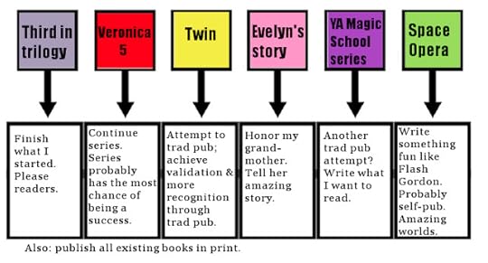 I will definitely be writing another Veronica book (which would be book 5). I have several ideas for book 5 as well as book 6, and the world and characters are so familiar and easy to get into now, it's just a matter of deciding that's what I'm doing next, and I'll crank it out. As such, though, it's not my top priority. I do think the Veronica series is the most likely to seriously take off. The decopunk trilogy is going to be too weird for a lot of people, and it has some flaws I just can't figure out how to fix, though I love the story and the characters. The decopunk trilogy has been such an opportunity to stretch myself as a writer, and for me that's worth it, but I am realistic about it. It's not what I set out to do when I started it, for one thing. I trying to create a story like Kushiel's Dart, only set in a decopunk 1920s type world. Loads of people (myself included) wish they could visit Terre d'Ange, and I wanted to create a setting like that. What came out, though, was a cold dystopia I would avoid visiting pretty much at all costs, though. Too much of my cynicism found its way into those books, and book three is going to be very much in the same vein. I don't know if I'm even capable of creating a world that people want to visit or live in. That's actually the core of my goal with the YA magic school series (which may end up being a New Adult rather than YA series, depending on how much sex I want to include--I haven't decided). Yes, I am absolutely going to aim for something reminiscent of Hogwarts, because I love Hogwarts, and I want to manage to write about a setting I love. I'll deviate quite a bit, too. For one thing, I dream of visiting the Mediterranean again one day, so the setting of my magic school will no doubt be very much a place like Corsica or Greece. Maybe it'll be inspired by Ancient Greece, or at least a fantasy version of Ancient Greece. And I can tell you that it's going to be a bit of a response to The Magicians, which I was terribly disappointed with. I mean, come on, what a cool premise! A college like Hogwarts, with adult students learning magic? A loser kid who has a chance to have everything he ever dreamed of? So cool! And then the loser kid never changes or grows or enjoys the gifts he's given. I wanted to throttle him. Anyway. Trying to talk back to The Magicians--that ought to challenge me to step away from my cynicism. If there's a core flaw in The Magicians it's the book's awful cynicism. But in any case, that one's not going to happen any time soon, I want to finish the trilogy and the book I labeled Twin in the flowchart first.