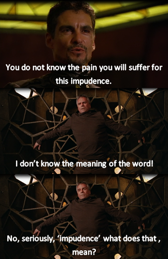 "'Ba'al?! As in 'bocce'?" - O'Neill in the same scene as above, when he first meets his torturer.What's even more disappointing as you peel back the layers is that one of the main things that makes Deadpool unusual is actually built on some old, overused ideas. Namely the crude humor. A lot of it grows out of the same old homophobia and misogyny powering all the "funny" not-gay-but-gay scenes in otherwise really good shows like Friends and Supernatural. And it's really too bad, because sometimes Deadpool seems to be embodying a new kind of masculinity, in which feminine poses and admissions of weakness don't undermine his strength. But then he "kisses" an early male encounter to cement his dominance over him, makes fun of the Brit for having the first name "Francis" (which clearly means the Brit lacks some essential masculinity) and provokes a fight in a bar by buying a guy a "blow job" shot and making it look like another guy sent it to him. Hilarious. What's more, Deadpool is just another man-child. He loves his toys (literally, he collects Voltron figurines) and can't face his illness with any kind of maturity, while Vanessa steps up right away. How many couples have we seen where this is the dynamic? Why aren't people sick of the man-child/woman-mommy relationship?!?