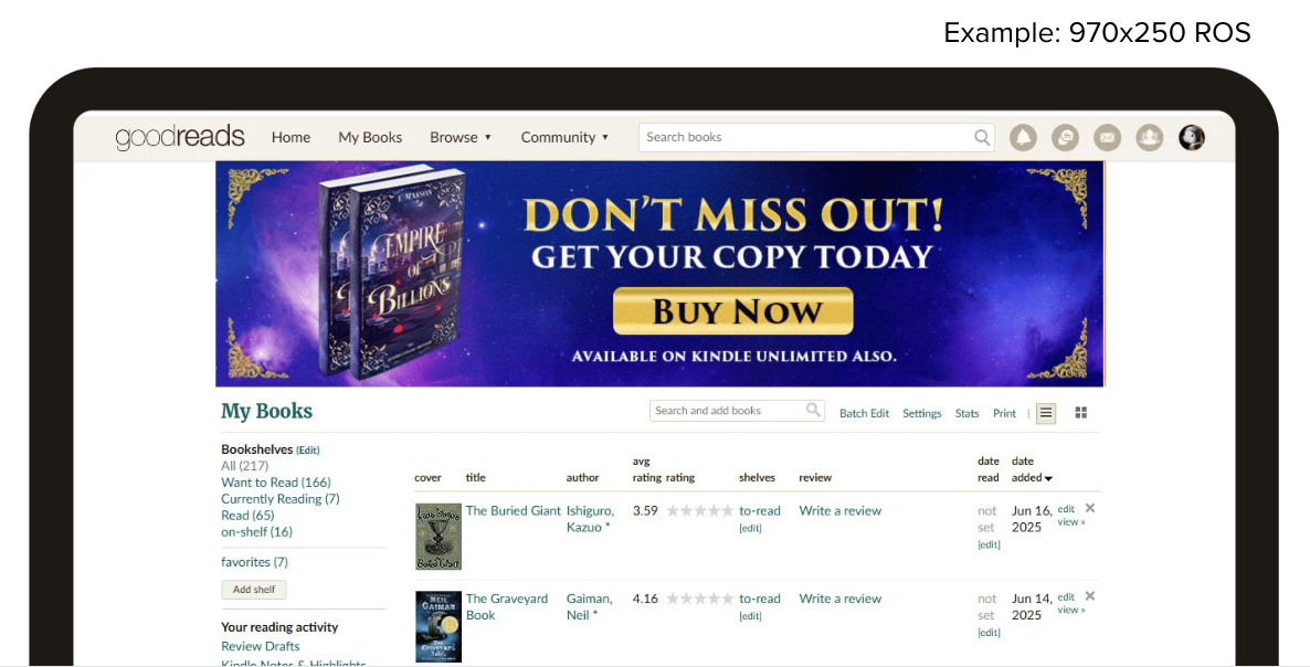 Display advertising on Goodreads uses a large format image to capture attention across the site. It delivers strong results, with an average 0.75% click through rate, and provides a highly visible way for authors to promote their titles to engaged readers. Authors are responsible for designing and providing the creative.