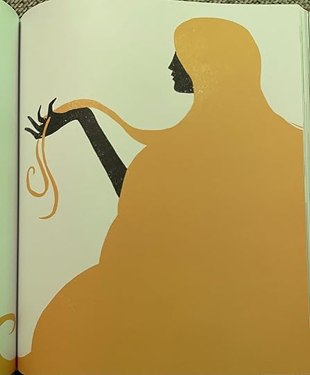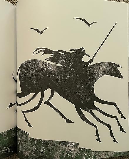 The illustrations are just amazing and I think it’s really made this book all the more fun and powerful to read! Every illustration is like a shadow illustration, you rarely see any kind of faces, unless it is the silhouette of someone sideways or one or two eyes visible against the black shadows. Given how different and interesting the Norse myths are, these illustrations really do fit the atmosphere of the stories and how the whole book feels. The majority of the images are all black but there are other colours mixed into some pictures too such as blue for the sea, yellow for golden hair and red for Loki’s eyes. There is an illustration on each page or double page spread and many times there is so much black that you get white text on black as the whole images seems to swallow the text. You can only get a sense for the pictures by seeing them, they really are brilliant, and I’m amazed how easy it is to see what is happening when a lot of the time all you see is shadows.