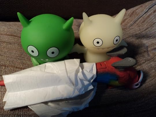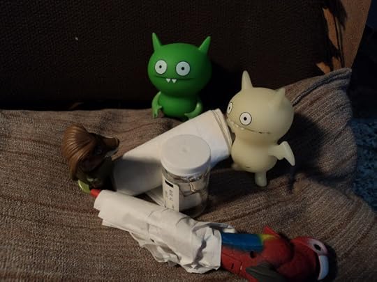 he rubbed some ointment on the wound and, on my suggestion, added a couple of stitches there as well. he dressed the broken wing in a sling of cloth. he braced the leg with two tongue depressors and wrapped it in tape.[image error]