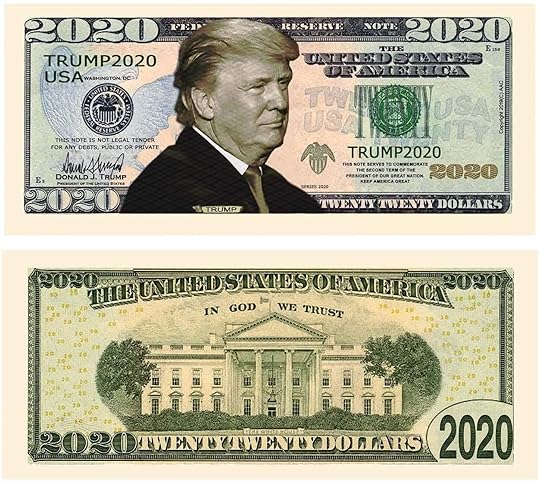Last bit apropos of nothing: I have a ton of bookmarks that I alternate, most of them homemade like laminated movie tickets, or reminders of places I've been, etc. If I have one that's related to the book I'm reading in even the remotest degree, I'll grab that one. This book gave me the perfect excuse to use my Donald Trump 2020 dollar bill.