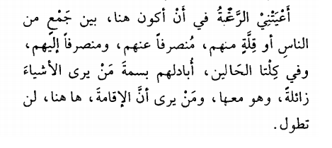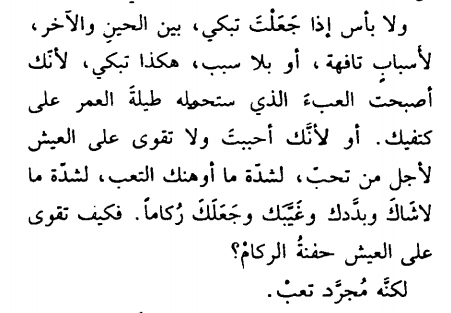 "تعب كمثل أن تنتبه فجأة وتجد أنك في المكان الخطأ، في اليوم الخطأ، وتجد أنك نفسك، الرجل الخطأ. ومع ذلك تتظاهر بأن ما وجدته في هذه الأخطاء كلها هو الصواب الذي أتاح لك أن تحيا إلى الآن."