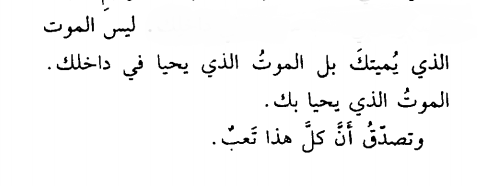 مـــا حكمة هذا الإصرار العنيد على رؤيــة ما يجعلك تتألم ، ما يعذّب روحك إلى آخــر ما يطيقه الألم منــك، كإنك تقف على الموج و لا تريد الغرق ، كإنك تمسّ النار و تخشى تحريقهــا ولشدّة ما تخيفك الهاوية تسقـــطُ فيهـــــا . أشيـــــاء كثيرة لا تدرك الحكمة منها وتقع فيها ،كما تقع في الخطيئة وتعلم أنك هُنـــا و لا مخلص في الجوار القريب أو الجوار البعيــد ، كأن تحب وتصدق أنك شفيت من الموت ،وأنك شُفيت من الفقدان ومن البئر التي في داخلك ،ولشدة ما تطمئن للبئر التي في داخلك ، تعتاد أن تكون وحدك .