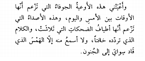 - هذا وجه لأنها تراه ، وهذا قلب لأنَّه أحبَّها ، وهذه روح لأنَّها تقيم في ألم انتظارها ، وهذا جسم لأنَّه من أجلها ينهض في الصباح ، ولا ينام لكي لا يخطئ موعد الصبح .