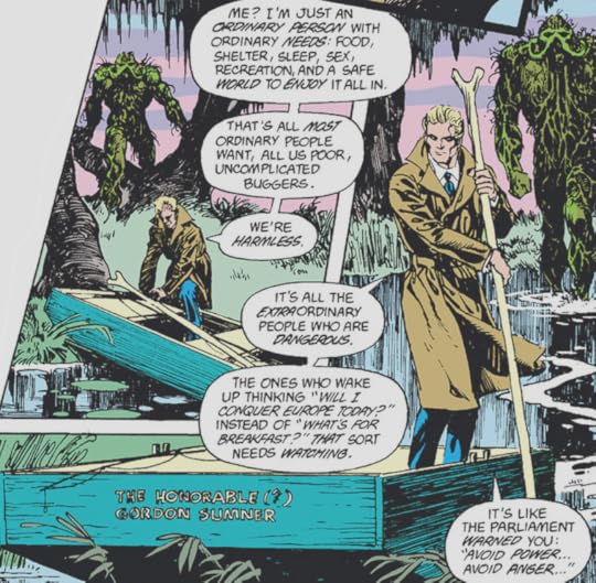 The writing throughout is clearly very good, but it was only in a handful of scenes (almost all about Swamp Thing's inner consciousness) that I found the description as potently evocative as Jamie Delano's in the first Hellblazer collection. Though reading that has perhaps shown me a new way to experience comics, and I found here that I would sometimes spontaneously imagine, without effort, sounds to go with the words and pictures in certain panels. The occasional reader or non-reader of comics may think of them as mostly about the art, but these have shown me how very important the writing is. When you have fewer words to work with, they need to be really good.