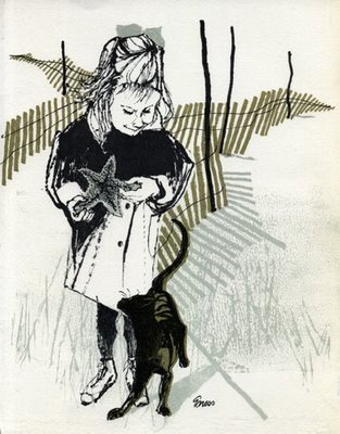 Really liked that Evaline Ness changes her media and the style she's working in, for each of her picture-books of her's I've read so far, to suit the themes of the book. I haven't seen the same use of media by any other illustrator, though they might exist. Evaline Ness uses print, and then draws on top of it with pencil and ink, and her use of it is masterful and unique.