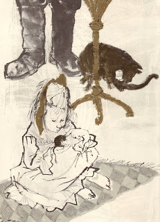 Although I have read a number of folktale adaptations illustrated by Evaline Ness - Algernon D. Black's The Woman of the Wood: A Tale From Old Russia, Charles Scribner, Jr.'s The Devil's Bridge: A Legend - this was the first book both written and illustrated by Ness that I have encountered. I have to say, I am very impressed! I found the narrative to be a sensitive and moving portrait of a young girl's first encounter with true consequences (although thankfully, all ends happily!), and the illustrations - done in black and white, with color accents in brown and grayish-blue - perfectly suited to the tale, accentuating the emotion of each scene. The style here is somewhat vintage, and not something I would normally find outstanding, but somehow - here - it all works. This one definitely deserved the Caldecott, I think!