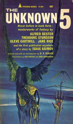 This is a collection of four stories that originally appeared in John Campbell's UNKNOWN (later called UNKNOWN WORLDS) magazine from 1940-1942, and one story by Isaac Asimov that was purchased for the magazine but did not see print because it folded before it could be published. The other authors are Cleve Cartmill, Alfred Bester, Theodore Sturgeon, and Jane Rice. The Sturgeon is a classic but the other stories are all quite good, too, and have help up well. A nice volume, with illustrations from Edd Cartier and John Schonherr.