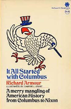 In It All Started with Columbus, Armour sets out to explain American history. Political history, mainly, but also the history of business, of religion (the Mormons were led by a man named ‘Bigamy Young’), of exploration and society and more. It’s all pretty crazy, because he plays fast and loose with facts—if you think at all that you’re going to really learn anything, you’re barking up the wrong tree. (As a matter of fact, you’ll probably only be able to truly appreciate this book if you already know the basics of Americana—there are lots of punny references to popular culture, to history and folklore and literature, that make sense only if you already know something about the US).