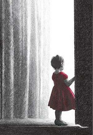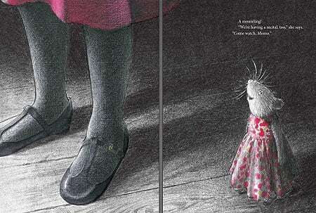 The story is rendered primarily in pencil and charcoal. The red acrylic gouache reserved for Momo’s dress and the Mouseling’s dress. (Their dresses are a marvel.) Reds and pinks are absent from the stage and characters in the human-occupied spaces…except Momo’s cheeks. Adding the hues to the mouses’ theater and performances adds to their vivid aspect; a lively, more intimate and interactive recital. Notice how the mice interact with one another versus the glimpse of the human audience.