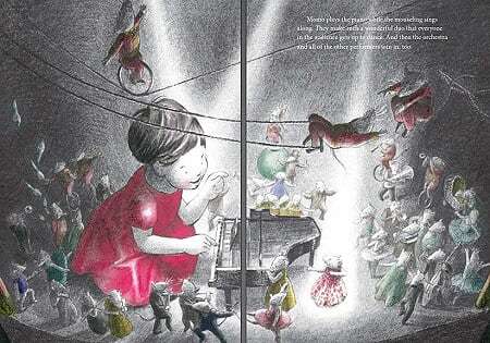 The Piano Recital is a beautifully illustrated tale with which many children will relate. The imaginative story follows Momo as she stands in the wings awaiting her turn to play the piano on stage. Through the mouse’s fears, Mom is able to deal with her own and overcome her stage fright. The text is simple, allowing the reader to study the gorgeous illustrations. While this is not a complicated story, the story and art will resonate with young readers.