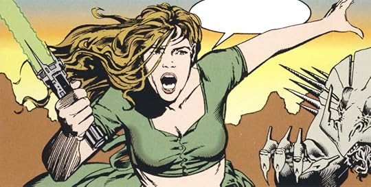 THE SAGA OF NOMI SUNRIDER: 4 stars The second set of strips in this collection is about Nomi Sunrider's journey to jedi knighthood. Nomi and her husband Andur, along with their infant daughter Vima, are going on a journey to the edge of the galaxy to find the jedi master Thon. But a crime lord known as the Great Bogga is after Andur Sunrider's box of Adegan Crystals, and may complicate things for our heroine Nomi. An easy pick for my favorite story arc in this collection, "The Saga of Nomi Sunrider" is, for the most part, quite strong. It still suffers from some of the same problems that the first arc had, namely the underdeveloped characters and iffy writing, but a strong story and decent artwork elevates this quite a bit. Despite being relatively simple, I found Nomi Sunrider to be a likeable and relateable protagonist, and I was invested in her. Even with the narration in the backgroud, I was engaged in her journey and her struggle to become a Jedi. So far, Nomi Sunrider is my favorite Tales of the Jedi character, and she's the one I am looking forward to seeing the most in the coming issues.