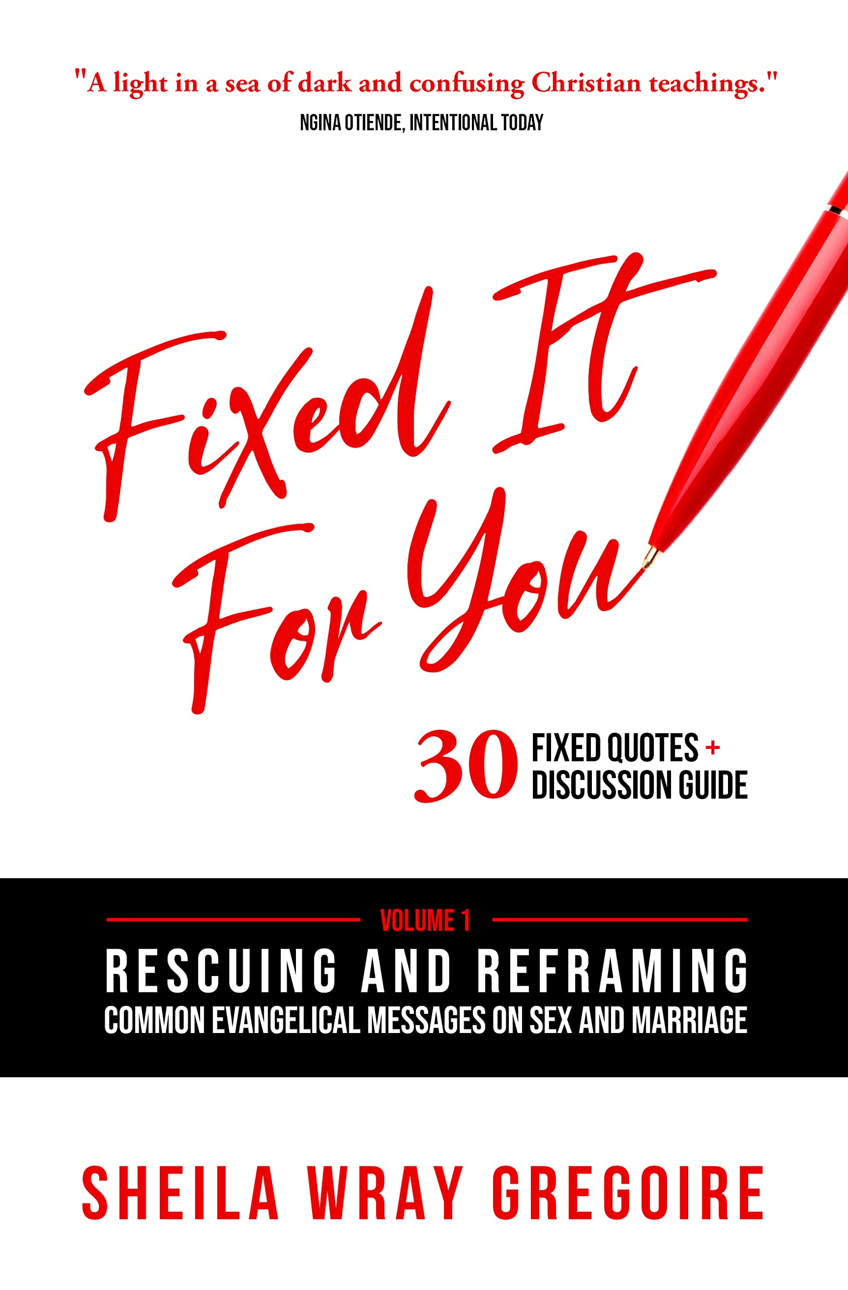 Fixed It for You is a compilation of quotes highlighting popular Christian teachings regarding marriage and sex. The book is divided into six sections including 1) Masculinity, 2) Femininity, 3) Marriage, 4) Sex, 5) Responsibility for Sin, and 6) Boundaries. Quotes are taken from a variety of sources including books, social media posts, and sermons. The original quote appears in bolded letters with the edited or "fixed" portion written over in red. While most of these edited quotes have been published on Sheila's social media pages, this short book comes with the additional content of the original quote's context, discussion questions to use with groups, and finally, an application section that teaches readers how to further discern between helpful vs. unhelpful/harmful teaching (1. Test the Fruit, 2. Bring it Home, 3. Recognize Red flags).