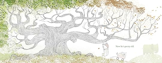 It is the pictures that tell the story here. Smith has lightened the characters down to line drawings and subtle color. The topiaries are a vivid green, bursting with life against the white of the page. Grandpa’s memories are more solid than the real world, which works beautifully with the story. The topiaries are whimsical and gorgeous, shown as the little boy moves through the garden and interacts with them. There is one amazing page with the boy hanging from a branch of a giant tree where the leaves turn from green to autumn to bare branches as the eye moves across the tree. It is a visual of aging that works beautifully.