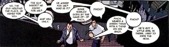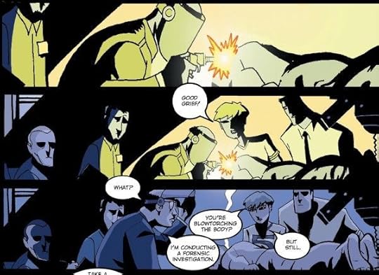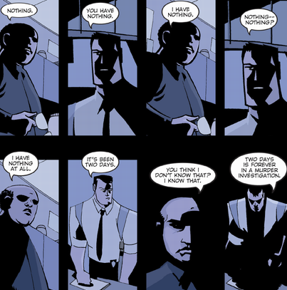 As for the story: well, it's procedural, not mystery. There are no surprise twists, just a slow walk forward on the evidence. It's actually the weakest part of the storyline, as no one figures out that the graffiti might be important until the end of issue three. (But perhaps that's just an issue with the artwork making it a little too obvious.)