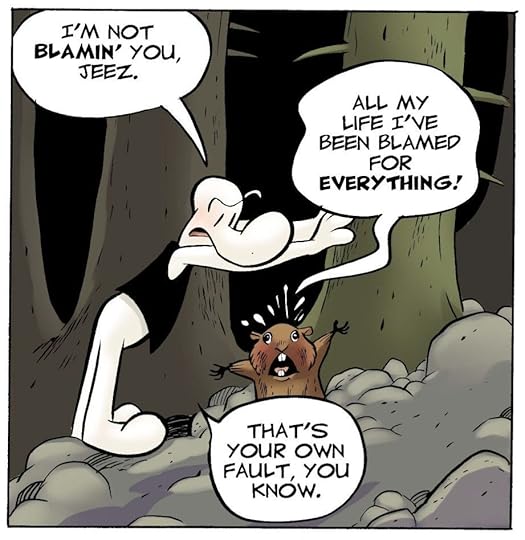 I know it’s a stretch, but Bone reminds me of Lord of The Rings. I watched a video discussing this and though his points were stretched and didn’t have great evidence (only used books 1 & 2) I can start to piece together the parallels. Book 1-3 are the fellowship, in which, an uncanny hero in chosen to take on an adventure with a princess and queen of an old kingdom (which nobody knows they are apart of the royal family) to defeat an old evil ruler. Man sounds familiar. Now in books 4-6 we have the splitting of the group both tackling their own problems. The towns people are fighting the rat creatures and Fone Bone and Smiley Bone dealing with being lost in the woods fending from Rock Jaw and the Lord of the Locusts. Man also sounds familiar. However, excited for the final three books.