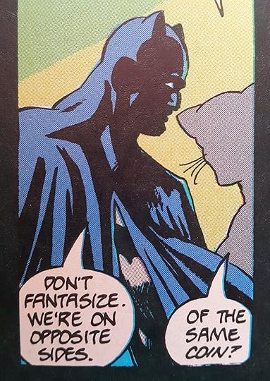 Needless to say I'm not a fan of the "dark age", post-Watchmen, Miller uninspired edgy style of the late 80s and the 90s, however I treat those stories as bizarre artifacts produced in this medium, products of their time and poor decision making, capturing in a way the spirit of that period. I'd prefer Mindy Newell had the liberty to write Catwoman the way she was interested, in her style, not as a companion book for someone else's vision.