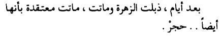 يحكى أن زهرة نبتت بين حجرين كبيرين، كان الحجران كبيرين لدرجة أنهما حجبا عنها كل ما في الجوار، لم تكن الزهرة تلتقي بالعشب، أو الأرانب، أو الأشجار، أو العصافير، أو السناجب، أو الجداجد، أو أقاربها من الأزهار، لم تحادث أحدا ولم يتحدث إليها أحد، لم تر الزهرة شيئا باستثناء الحجرين الكبيرين، والسماء من فوقها.. بعد أيام، ذبلت الزهرة وماتت، ماتت معتقدة بأنها أيضا.. حجر