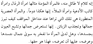 * إن ذلك هو سجن عصور العبودية ، إن ما يجري هو ألعوبة خان الحريم الجديد الذي شرعت ابوابه أمام كل الأوغاد و الشاذين . وبين هذه و تلك لا بد من البحث عن شخصية للمرأة مختلفة ينبغي أن تتحللى فتياتنا بتلك الشخصية . إن يؤدين دورا فاعلا بدل التقليد و التشبه بالرجال و التصنع ، أن يمتلكن شخصية مستقلة يعجز أي رجل عن الاستعاضة عنها.