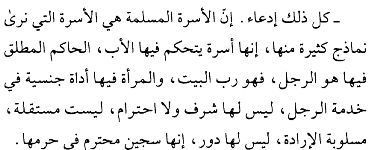 " إن الأسرة المسلمة هي الأسرة التي نرى نماذج كثيرة منها ، أنها أسرة يتحكم فيها الأب ، الحاكم المطلق فيها هو الرجل ، فهو رب البيت ، و المرأة فيها أداة جنسية في خدمة الرجل ، ليس لها شرف و لا أحترام ، ليست مستقلة ، مسلوبة الارادة ، ليس لها دور ، إنها سجين محترم في حرمها " حسن و محبوبة / علي شريعتي الكتاب يتحدث عن الدين و مفاهيمه ، و كيف ان رجال الدين يفتون على هواهم ، كلٌ بما يروق له و نحن نطيع و نمشي ورائهم بحجة انه سيدة زينب كانت تفعل ذلك فنحن يجب انه نفعله و اني علي (ع) كان زاهدا متوصفاً و يجب على الرجال ان يكونوا كذلك ، كلا هذا المفهوم خطأ فهم لم يكن لديهم هذه الصورة فقط ، لو كان عليٌ (ع) متصوفاً فمن كان يجاهد و يستشهد !! هنا يجبنا المعلم و يشرح لنا كل شيء عن الدين و الأمثال التي يأتي بها الدعاة .