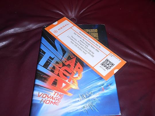 I loved this movie when mama took me and a friend[1] to see it in the theater when I was eight years old, and I still love it, though for different reasons. Mama and I even went to see it again a few years ago, and I saved the ticket to use as a book mark. This technically wasn't its first outing since my Batman (1989) ticket is on the other side, and I used that when I read The Dogcatcher, but I've been waiting to use it again with this book and turn the Star Trek side to the front.