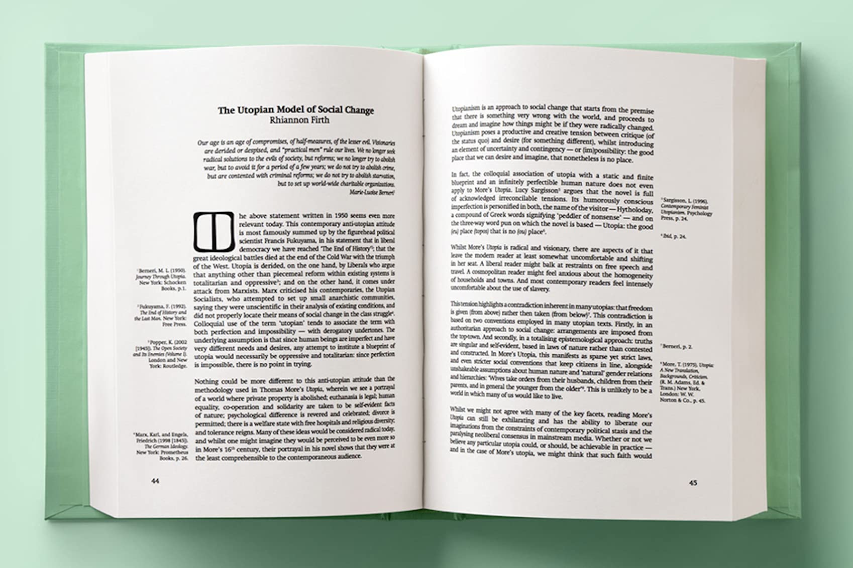 Place and Mexico City, 2018 This book shows the work selected by the curator of an exhibition alluding to the commemoration of the 500th anniversary of Thomas More’s Utopia. The design ediorial is thought from a concept of no territory, where lines that are cut and reappear generate a sensation of a space that does not exist. To achieve greater emphasis on the artistic work extremely clean reticles were used where appointments, titles and other elements coexist without generating tension. For the capitulars, the alphabet that Thomas More created at the time was redesigned.