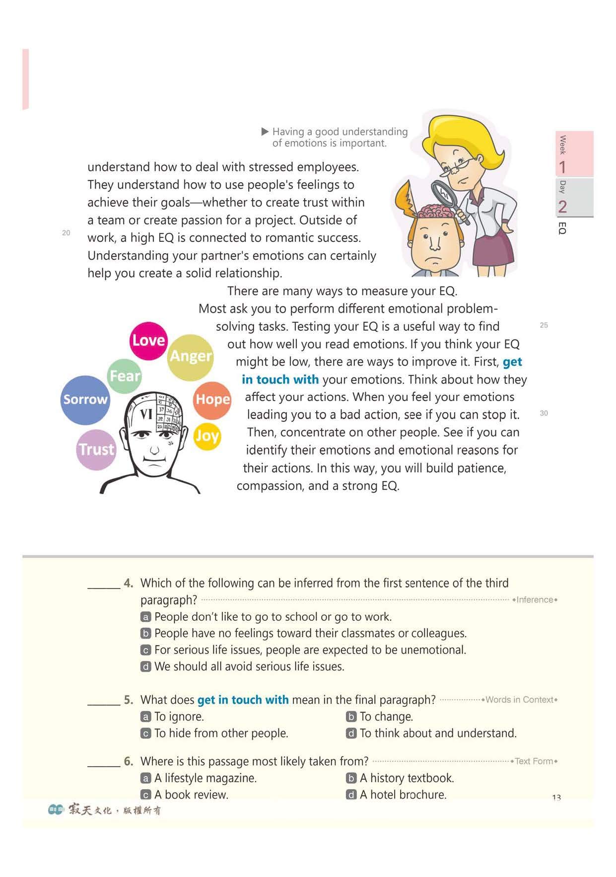 The questions accompanying each article cover the following six main idea, subject matter, supporting details, inference, words in context, and others. Through repeated practice with these six categories of questions, readers will develop an inquiring attitude toward reading and will gradually gain the ability to glean important information from an article. Furthermore, this thinking-while-reading strategy will develop the reader's ability to engage with texts at a higher level of comprehension.