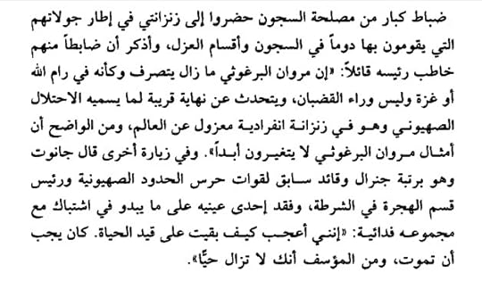 طول ما أنا بقرأ الكتاب ده بفكر.. أية قدرة التحمل دي؟ وأيه الأيمان بالقضية المتمكن من الروح ده؟!؟ مروان البرغوثي بيحكي عن مرتين أعتقل فيهم وركز أكتر على المرة الثانية لأنها كانت الأطول والأقسى بيحكي عن كل المعاناة اللي شافها والعذاب اللي كان فيه ومدى قسوة الحبس الأنفرادي طول الفترة اللي قضاها فيه بيحكي بكل سلاسة وهدوء وكأن حد تاني اللي كان بيمر بكل الوجع ده بيحكي بكل صور الأيمان بالقضية والتحمل والصبر والوجع الكتاب وصلي كل احساسه وروحه الهادية المثابرة أول مرة أقرأ في أدب السجون وأتمنى أكررها قريب