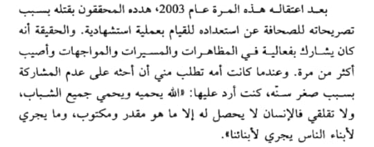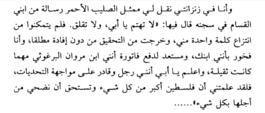 الكتاب جميل وأعطاني صورة مقرّبة عن مروان البرغوثي واعتقالات الإحتلال الصهيوني له والقابع الآن في سجون الإحتلال إلى الآن وتضحيته لحريته في سبيل تحرير فلسطين من أيدي الصهاينة إذا كان ثمن حرية شعبي فقدان حريتي...فسأدفع هذا الثمن" يكتب عن تجربته الأليمة في الأسر وتعذيبه من قبل الإحتلال الصهيوني..يعطينا دروسا في الإنتماء والحب للوطن أكثر وأكثر..الحرية نعمة وحرية الوطن من تحت قيد الاحتلال الصهيوني من أهم حقوقنا التي يجب أن نأخذها ونسترجعها ونعود لفلسطين وهي خالية وحرة من كل صهيوني وقد ذكر مروان البرغوثي في كتابه: