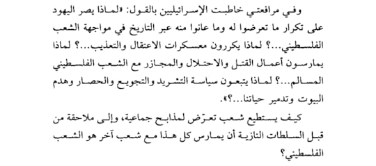 .. كتاب مهم يذكر ضمائرنا كى لا ننسى القضية الفلسطينية فووجود الكيان الصهيونى فى قلب الامة سكين زرعة المستعمر ونزف هذا الجرح الدامى شهداء فاضت بهم الارض وضاعوا من الذاكرة الكتاب يصنف ضمن ادب السجون تتطرق خلالة الكاتب الى تفاصيل الاعتقال الى تجرى فى الاراضى الفلسطنينة على يد قوات الاحتلال ياخذك مروان البرغوثى من يدك ويصف لك كل ما حدث له اثناء الاعتقال وانت تقرا السطور ترتعش لكمية العذاب الى يتعرض لها المعتلقين فى السجون انه جو غاية فى الكئابة وخاصة عندما يتم عزلة فى زنزانه فردية دون ان يكلم احد ابشع انواع التعذيب هو العزلة التى يمكن ان تصل بالمعتقل الى حافة الجنون ان التحلى بالايمان بالله والثبات على المبادئ هو طوق النجاه الوحيد فى هذا المعزل كما يروى لنا مروان فى رسالة كتبها لابنه قسام قصة وجود الكيان الصهيونى منذ وعد بلفور ومرورا بنكبة 48 وحتى قيام الانتفاضة الفلسيطنية من الملعومات الى لفتت انتباهى وفزعتنى ان ربع الشعب الفليسطنى تم اعتقالة اكثر من ملبون مواطن عربى تم اعتقالة خلال الفترة دى على مراى ومسمع من حكام العرب !!!!!