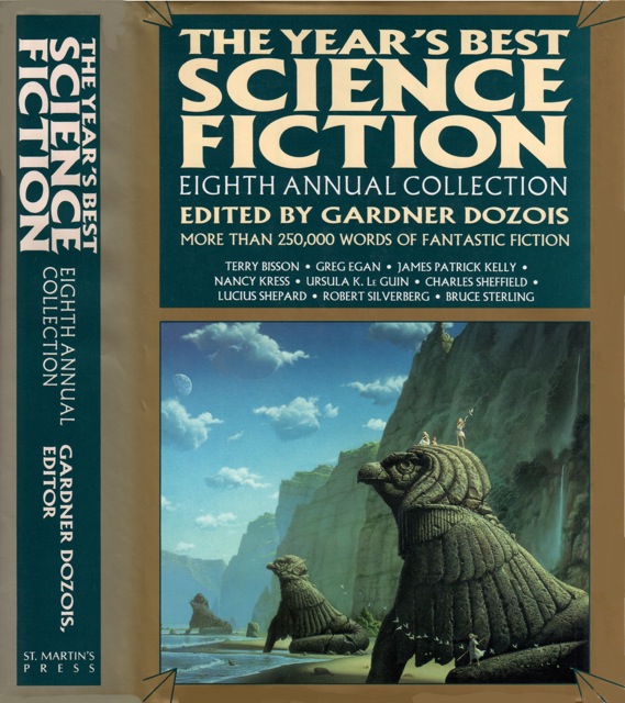 Overall, this edition featured one of the strongest groups of stories out of the five of Dozois’ Year’s Best anthologies I’ve read so far. Favorites include Ursula Le Guin’s clever mashup of exploring her Hainish people’s cultures while also playing with the relativity of time, “The Shobies’ Story”; Bruce Sterling’s “We See Things Differently,” a fascinating exploration of Arab and American relations; Terry Bison’s delightful, award-winning “Bears Discover Fire”; Dafydd aB Hugh’s remarkably titled, brilliantly conceived, and perfectly executed “The Coon Rolled Down and Ruptured His Larinks, a Squeezed Novel by Mr. Skunk”; Ted Chiang’s classic, award-winning “Tower of Babylon”; and John Brunner’s tough-minded “The First Since Ancient Persia.”