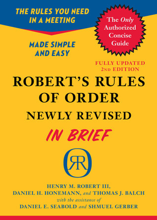 The full edition of Robert's seems to be inaccessible to most. It is, in fact, a slog to read, but it does help organizations solve their thorniest problems. Robert's in Brief, while not being a fun read, is a really solid handbook for anyone in a position of leadership. I gave copies of this to my great-niece and nephew for their Greek meetings.
