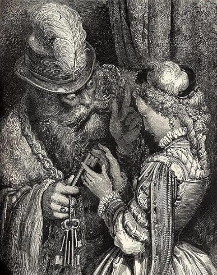 So this guy is rich, but he has a BLUE beard. <--no idea what the author was trying to say about men with blue beards, but it's a weird thing to have happening on your face. Even back then. He's having a hard time getting a wife because of said blue beard (and I'm assuming all those missing wives), so he invites two sisters to his house to show off all of his goodies. And the younger one decides that after seeing how much $$$$ this guy has that...well, his beard isn't all that blue.
