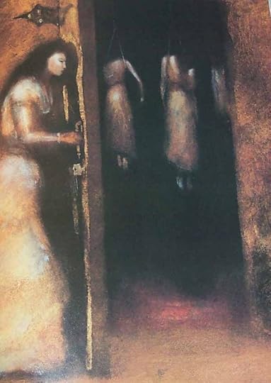 The hell, my man? Of course, she can't resist that room now. <--it's what he wants So after she throws a big wingding for all of her friends (b/c why else marry a guy with a blue beard if not to throw all the lavish parties?), she sneaks into the forbidden room. And guess what? Yes, exactly! A whole pile of dead wives. Just...hanging around all bloated and crusty. And the floor is inexplicably coated with magic blood. Magic? <-- you say Yes, magic. Because she drops the damn key on the floor and the blood won't wash off it. AND NOW HE'S GONNA KNOW.