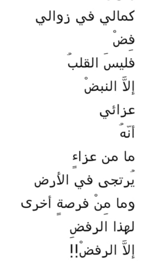 كمالي في زوالي فضْ فَليسَ القلبُ إلَّا النبضْ عزائي أنَّهُ ما من عزاءٍ يُرتجى في الارض وما مِن فرصةٍ أخرى لهذا الرفض إلَّا الرفضْ!
